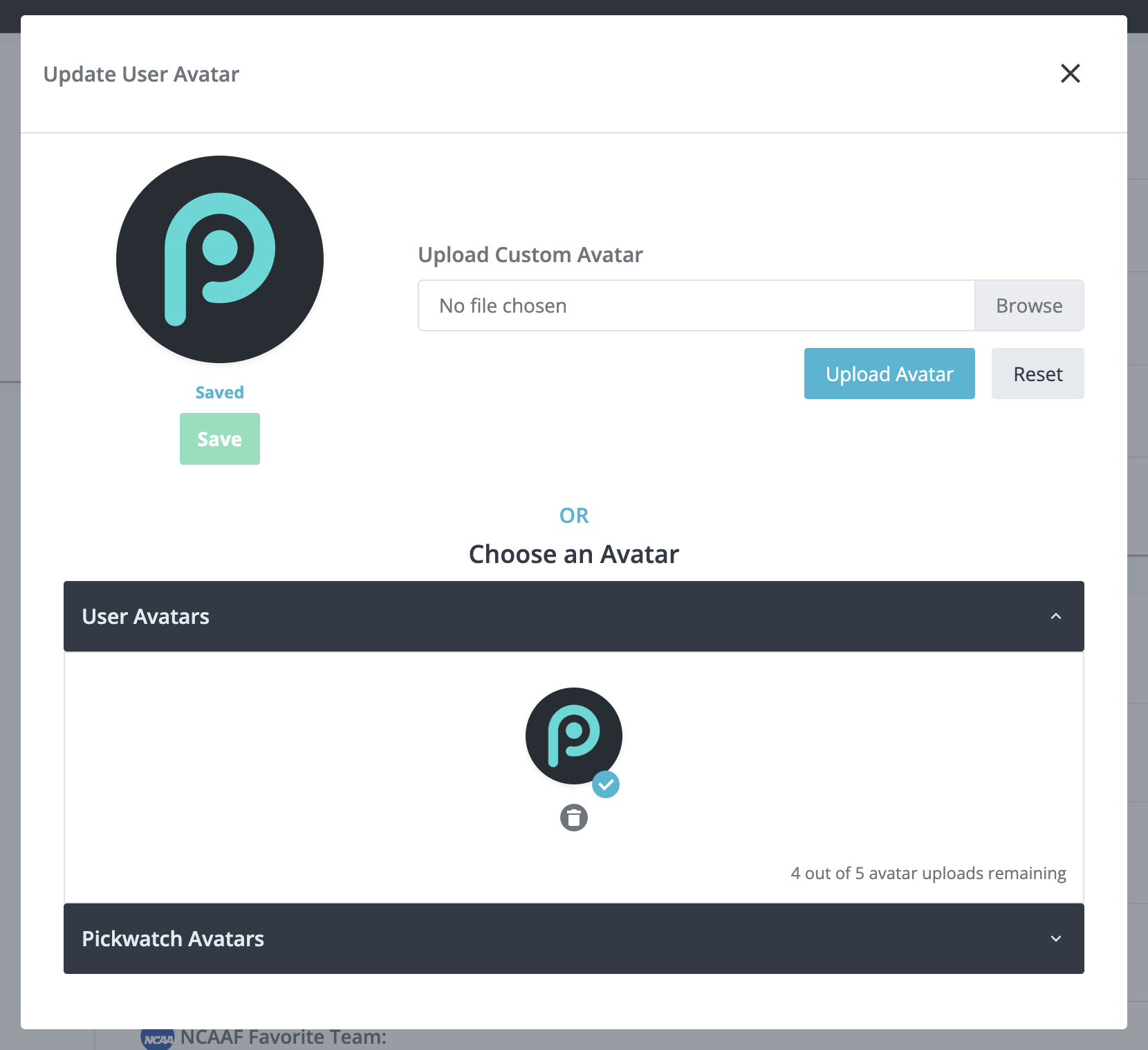 You'll also have the option to select any avatar you may have previously uploaded or use one of Pickwatch's custom avatars.