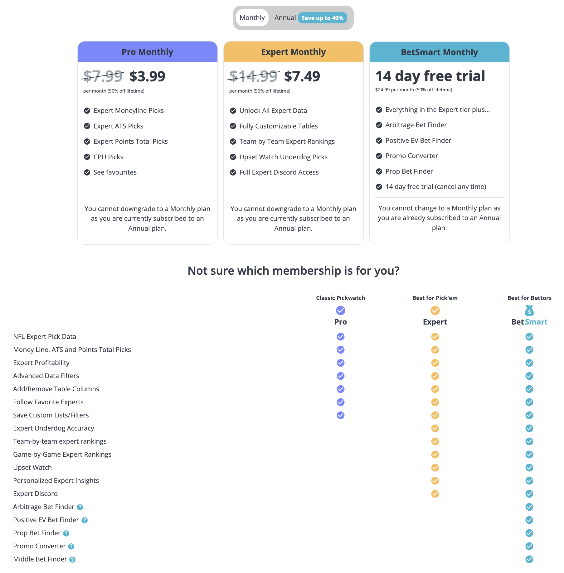 Expert offers a few additional services such as Upset Watch, CPU Picks, and access to chat to some of our top experts via our Discord, and BetSmart provides access to all of our betting tools.
